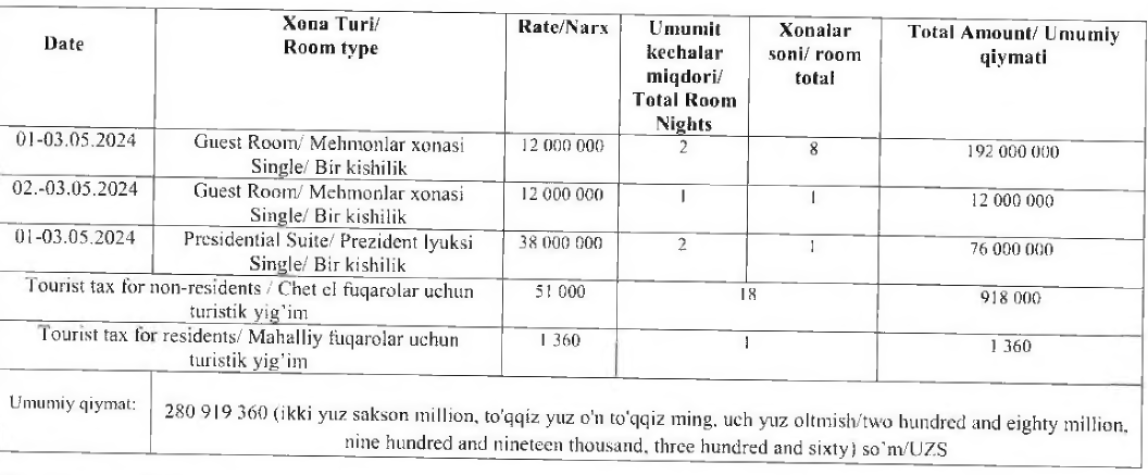 “В ходе визита в гостинице «Hilton Tashkent City» были арендованы номера для руководителя делегации, сопровождающих лиц и сотрудников Службы государственной безопасности Президента Республики Узбекистан”, - говорится в служебном письме.