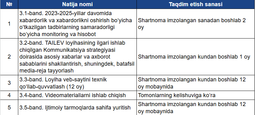 2025-2026-yillarga mo‘ljallangan shartnoma doirasida kompaniya quyidagi xizmatlarni ko‘rsatishi kerak: