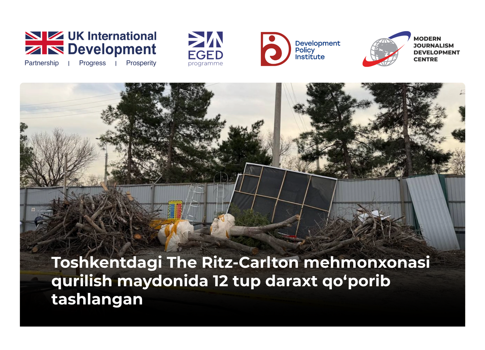 Poytaxtning Chilonzor tumanida The Ritz-Carlton Tashkent mehmonxonasi qurilayotgan maydonda 12 tup qimmatbaho daraxt qo‘porilib tashlandi. Bu haqda Milliy ekologiya va iqlim o‘zgarishlari qo‘mitasi raisi maslahatchisi, ekologik qonunchilikni takomillashtirish bo‘yicha mutaxassis Rasul Kusherbayev xabar qildi.