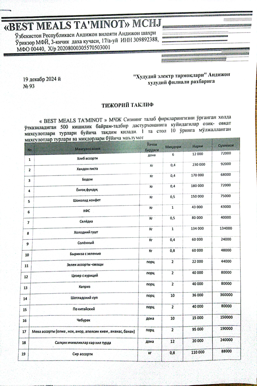 Best Meals Ta’minot HETning Andijon bo‘limi uchun umumiy ovqatlanish xizmatlarini tashkil etish bo‘yicha 180 mln so‘mlik bitta to‘g‘ridan-to‘g‘ri xaridga ega.