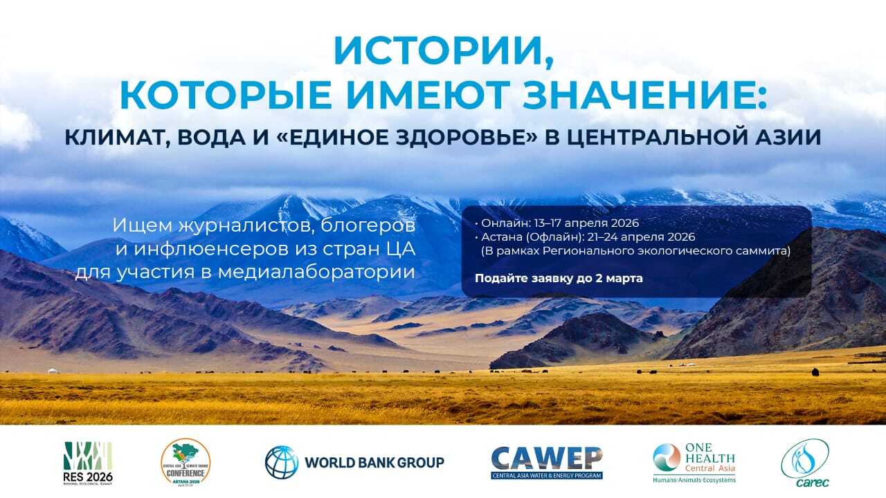 Водно-энергетическая программа для Центральной Азии (CAWEP), администрируемая Всемирным банком, совместно с Региональным экологическим центром Центральной Азии (РЭЦЦА) в рамках проекта «Единое здоровье» - инициативы, направленной на предотвращение эпидемий, обеспечение жизнестойкости продовольственных систем и здоровья экосистем в Центральной Азии - объявляют о проведении медиалаборатории (Media Lab) для журналистов, блогеров, и лидеров общественного мнения (инфлюенсеров) из Республики Казахстан, Кыргызской Республики, Республики Таджикистан, Туркменистана и Республики Узбекистан.