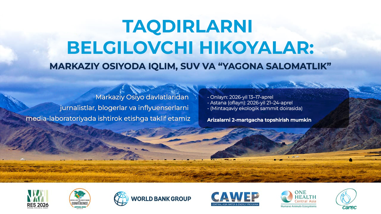 Markaziy Osiyo uchun suv-energetika dasturi (CAWEP), Jahon banki tomonidan boshqariladi, hamda Markaziy Osiyo mintaqaviy ekologik markazi (CAREC) “Yagona salomatlik” loyihasi doirasida — epidemiyalarning oldini olish, oziq-ovqat tizimlarining barqarorligini ta’minlash va ekotizimlar salomatligini mustahkamlashga qaratilgan tashabbus — Qozog‘iston Respublikasi, Qirg‘iz Respublikasi, Tojikiston Respublikasi, Turkmaniston va O‘zbekiston Respublikasidan jurnalistlar, blogerlar hamda jamoatchilik fikri yetakchilari (inflyuenserlar) uchun Media laboratoriya (Media Lab) o‘tkazilishini e’lon qiladi.